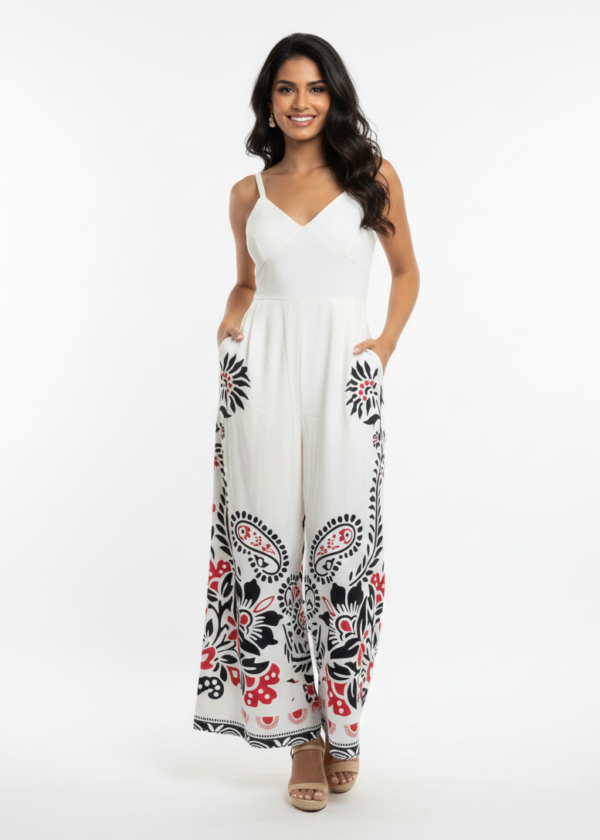 Printed Jumpsuit features a flattering V-neckline with adjustable spaghetti strap